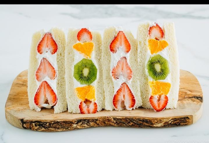 sandwich buah jepang, yang dilapisi oleh cream lembut manis dan diapit oleh lapisan roti.